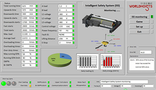 遠程監控: 通過物聯網遠程管理、實時掌握智能起重機運行狀態,實時顯示各個機構運行參數、損耗、剩余壽命。無論身處何方,通過授權的遠程診斷系統,均能實現遠程故障診斷和預防性維保,確保智能起重機處于良好狀態。