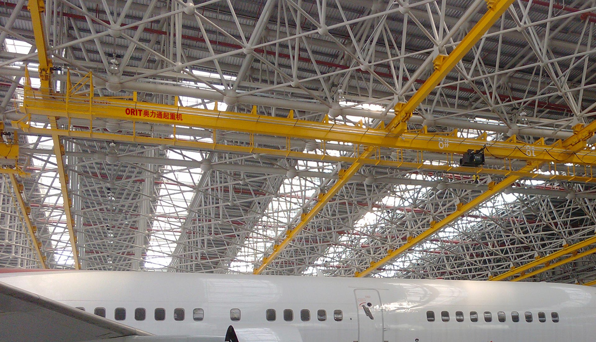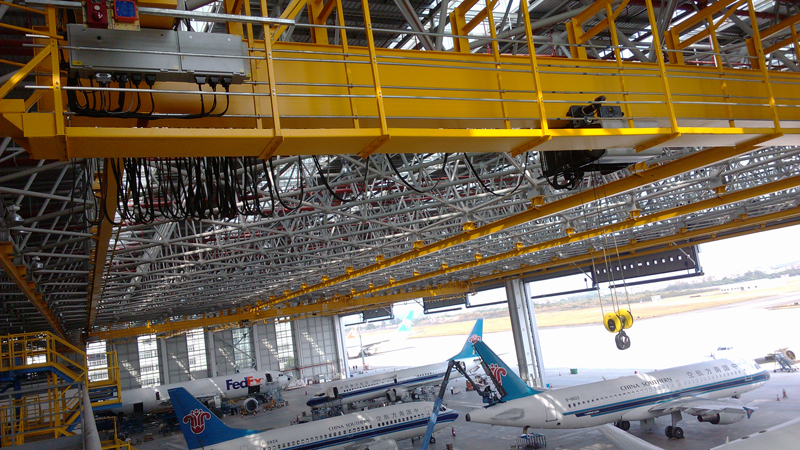 應用于飛機制造工廠、飛機維修機庫、飛機噴漆機庫、飛機拆解機庫,適配A380、A330、B747、B787、C919、C929、Y20等全系列飛機,最大跨度90米,最多7支點。 ○ 自重輕、輪壓小、高度矮