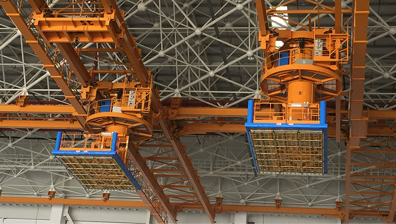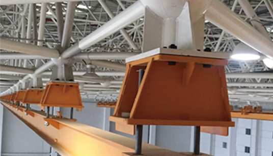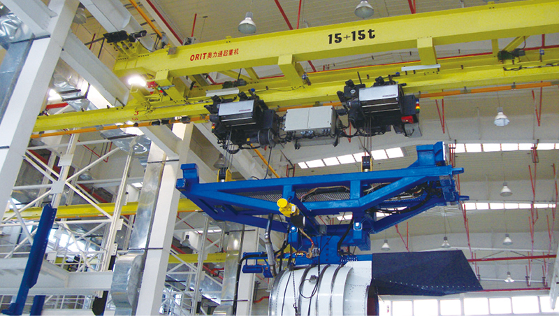 應用于飛機發動機制造工廠、飛機發動機維修工廠、飛機發動機試驗工廠,單梁、雙梁、三梁等多種吊裝方案適配各型航空發動機。過跨、道岔、轉軌器等等多種上部分路滿足各種工藝布局,最大起重量達到35t+35t。 ○ 智能操控,自動插拔銷,自動裝卸,運行平穩