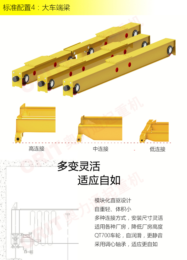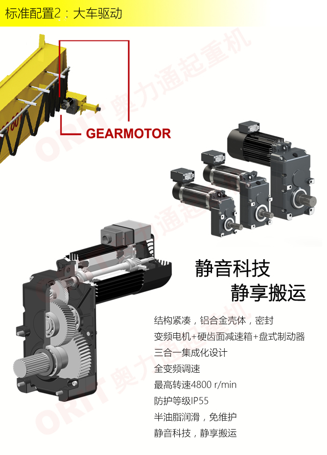 產品名稱:雙梁橋式起重機 小身材、大能力、高智慧 優化設計,自重輕,輪壓小,高度矮 硬齒面柔性驅動,緊湊型結構 變頻控制,運行平穩 實時安全監控,確保吊運安全 標準化配置,讓性能無比穩定 適用于80t以下雙梁起重機 標準配置1:起升機構 顛覆傳統,自成一體 SWL(t) HOL(m) 0.8t-80t Max.90m 低凈空設計 柔性驅動,內應力小,傳動效率高 柔性鉸接小車架 重級制電機,接電持續率60%ED 行走變頻無極調速,運行平穩 自調試電磁盤式制動器,可靠,防塵 2160N/mm2 高強度鍍鋅鋼絲繩,免維護 全周型導繩器,防松繩 全系標配安全監控系統 標準配置2:三合一驅動 靜音科技,靜享搬運 結構緊湊,鋁合金殼體,密封 變頻電機+硬齒面減速箱+盤式制動器 三合一集成化設計 全變頻調速 最高轉速4800 r/min 防護等級IP55 半油脂潤滑,免維護 靜音科技,靜享搬運 標準配置3:電控系統 安全隨心掌控 智能安全監控器 計算起升機構剩余安全工作時間 累計起升工作時間 累計超載次數 累計起升電機啟動次數 起升電機過熱保護及報警 剎車片厚度報警 ... ... 遠程通訊 施耐德電氣元件 航空插座接口 IP55防護等級 標準配置4:端梁 多變靈活,適應自如 模塊化直驅設計 自重輕、體積小 多種連接方式,安裝尺寸靈活 適用各種廠房,降低廠房高度 QT700車輪,自潤滑,更靜音 采用調心軸承,適應更自如 應用