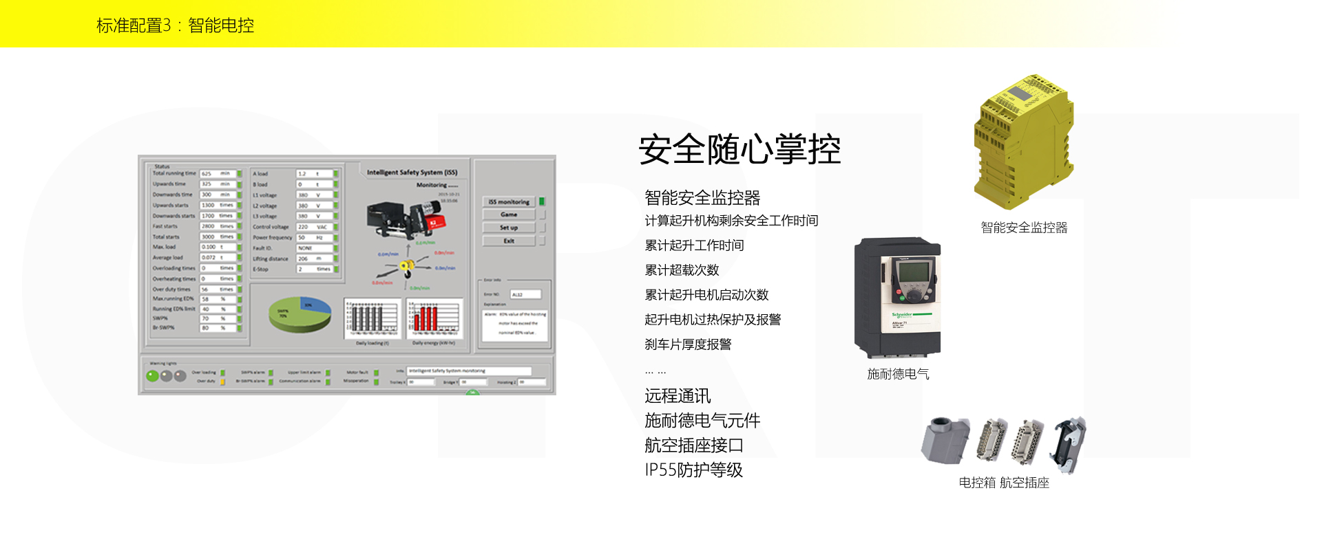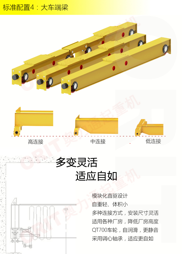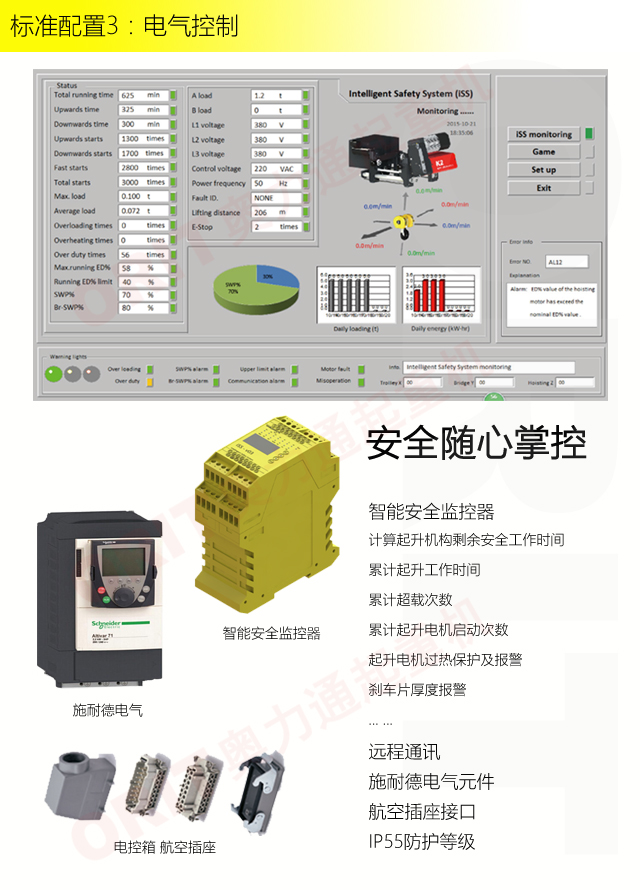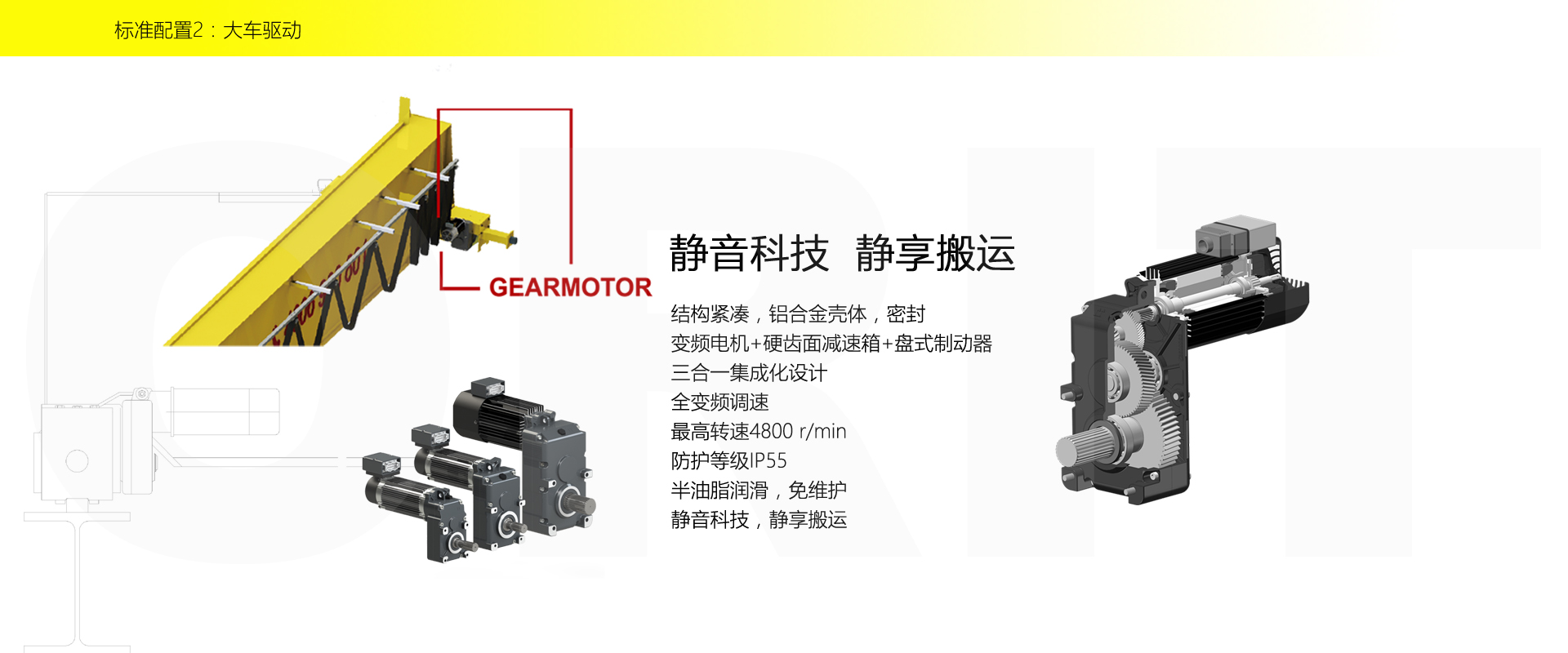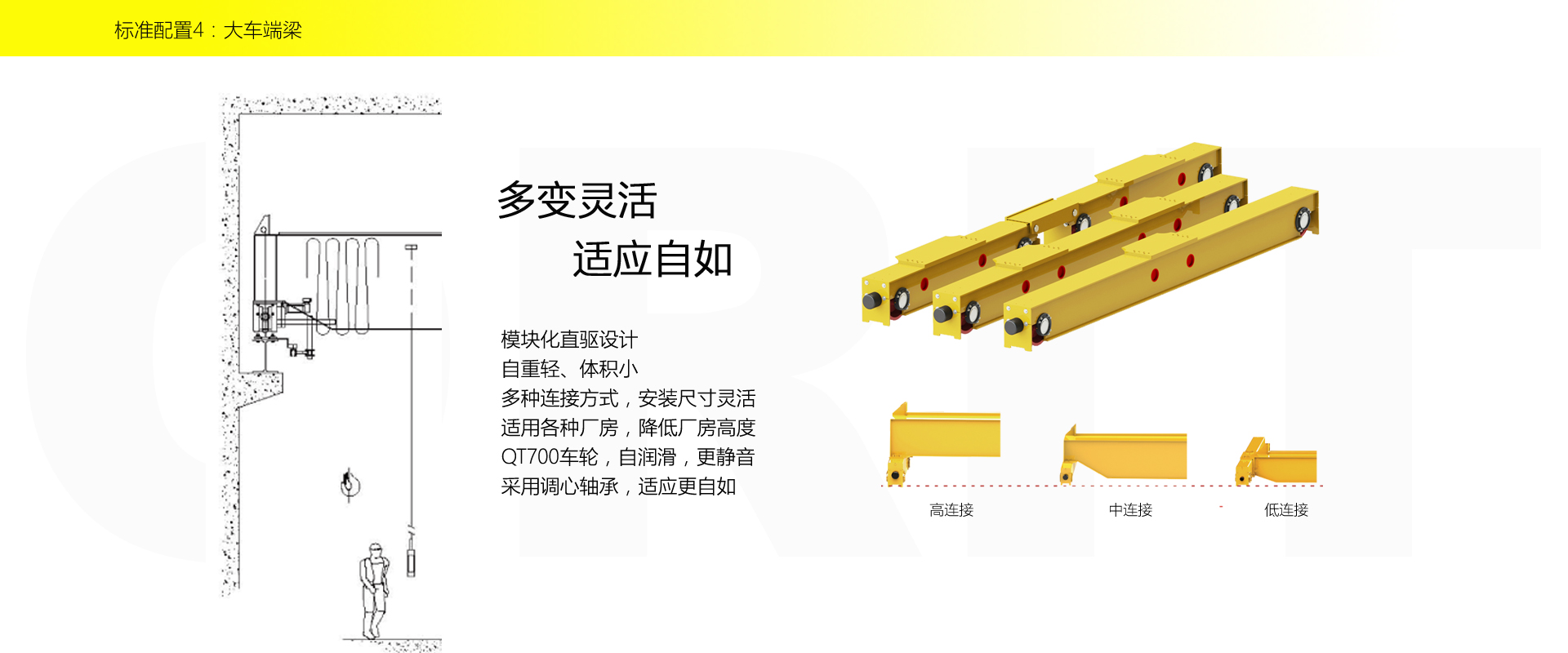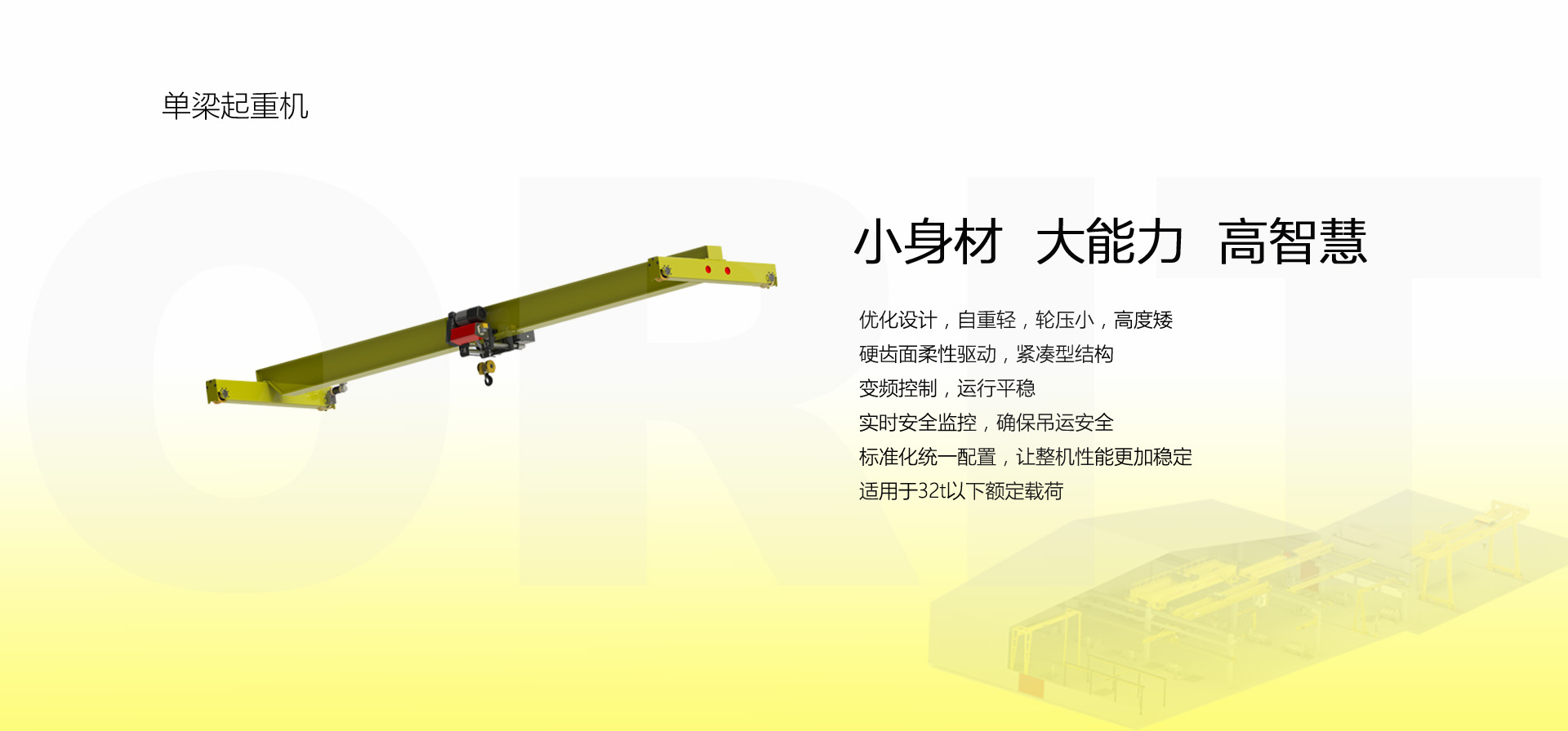 產(chǎn)品名稱:單梁橋式起重機 小身材、大能力、高智慧 優(yōu)化設(shè)計,自重輕,輪壓小,高度矮 硬齒面柔性驅(qū)動,緊湊型結(jié)構(gòu) 變頻控制,運行平穩(wěn) 實時安全監(jiān)控,確保吊運安全 標(biāo)準(zhǔn)化配置,讓性能無比穩(wěn)定 適用于32t以下額定載荷 標(biāo)準(zhǔn)配置1:起升機構(gòu) 顛覆傳統(tǒng),自成一體 低凈空設(shè)計 柔性驅(qū)動,內(nèi)應(yīng)力小,傳動效率高 重級制電機,接電持續(xù)率60%ED 行走變頻無極調(diào)速,運行平穩(wěn) 自調(diào)試電磁盤式制動器,可靠,防塵 2160N/mm2 高強度鍍鋅鋼絲繩,免維護 全周型導(dǎo)繩器,防松繩 全系標(biāo)配安全監(jiān)控系統(tǒng) 標(biāo)準(zhǔn)配置2:三合一驅(qū)動 靜音科技,靜享搬運 結(jié)構(gòu)緊湊,鋁合金殼體,密封 變頻電機+硬齒面減速箱+盤式制動器 三合一集成化設(shè)計 全變頻調(diào)速 最高轉(zhuǎn)速4800 r/min 防護等級IP55 半油脂潤滑,免維護 靜音科技,靜享搬運 標(biāo)準(zhǔn)配置3:電控系統(tǒng) 安全隨心掌控 智能安全監(jiān)控器 計算起升機構(gòu)剩余安全工作時間 累計起升工作時間 累計超載次數(shù) 累計起升電機啟動次數(shù) 起升電機過熱保護及報警 剎車片厚度報警 ... ... 遠程通訊 施耐德電氣元件 航空插座接口 IP55防護等級 標(biāo)準(zhǔn)配置4:端梁 多變靈活,適應(yīng)自如 模塊化直驅(qū)設(shè)計 自重輕、體積小 多種連接方式,安裝尺寸靈活 適用各種廠房,降低廠房高度 QT700車輪,自潤滑,更靜音 采用調(diào)心軸承,適應(yīng)更自如 應(yīng)用