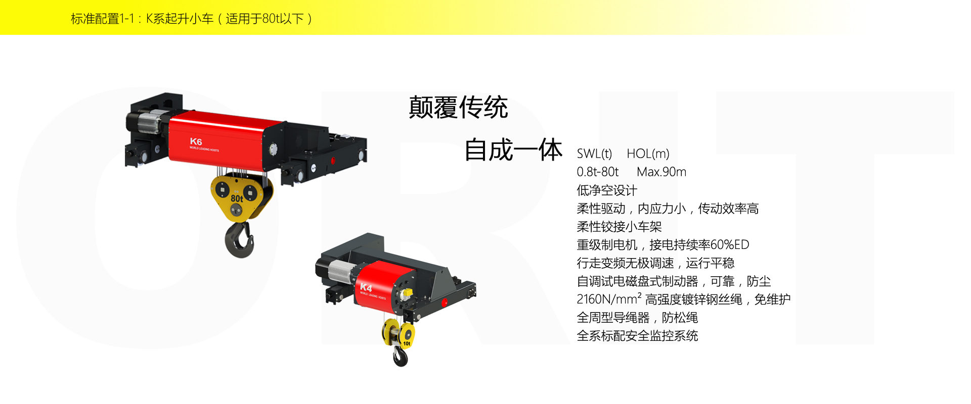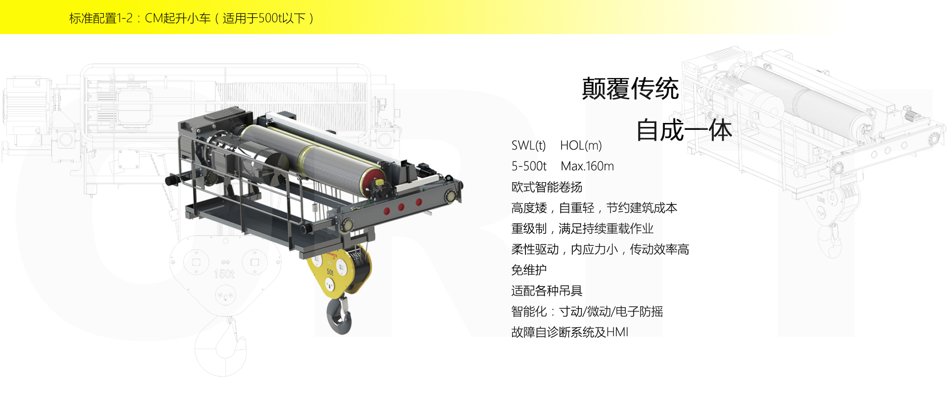 產品名稱:雙梁門式起重機 剛柔并濟 小體積 大能耐 優化設計,結構緊湊 柔性支腿,有效釋放應力,延遲結構壽命 柔性支腿,體積小,節省空間 變頻控制,運行平穩 實時安全監控,確保吊運安全 標準化配置,讓性能無比穩定 配置K系起升,適用于80t以下額定載荷 無牛腿車間搬運的最佳解決方案 配置CM智能卷揚起升,適用于500t以下額定載荷起吊 標準配置1-1:起升機構 SWL(t) HOL(m) 0.8t-80t Max.90m 低凈空設計 柔性驅動,內應力小,傳動效率高 柔性鉸接小車架 重級制電機,接電持續率60%ED 行走變頻無極調速,運行平穩 自調試電磁盤式制動器,可靠,防塵 2160N/mm2 高強度鍍鋅鋼絲繩,免維護 全周型導繩器,防松繩 全系標配安全監控系統 標準配置1-2:起升機構 顛覆傳統,自成一體 SWL(t) HOL(m) 5-500t Max.160m 歐式智能卷揚 高度矮,自重輕,節約建筑成本 重級制,滿足持續重載作業 柔性驅動,內應力小,傳動效率高 免維護 適配各種吊具 智能化:寸動/微動/電子防搖 故障自診斷系統及HMI 標準配置2:三合一驅動 靜音科技,靜享搬運 結構緊湊,鋁合金殼體,密封 變頻電機+硬齒面減速箱+盤式制動器 三合一集成化設計 全變頻調速 最高轉速4800 r/min 防護等級IP55 半油脂潤滑,免維護 靜音科技,靜享搬運 標準配置3:電控系統 安全隨心掌控 互聯網+ HIM人機交互界面 無線遠程控制 物聯網遠程管理 4G移動通訊 遠程診斷系統 信息系統 自動化 速度擴展功能 電子防搖功能 自動糾偏功能 寸動功能 防沖擊功能 自動中心定位 同步功能 智能安全監控器 計算起升機構剩余安全工作時間 累計起升工作時間 累計超載次數 累計起升電機啟動次數 起升電機過熱保護及報警 剎車片厚度報警 ... ... 遠程通訊 施耐德電氣元件 航空插座接口 IP55防護等級 標準配置4:端梁 多變靈活,適應自如 模塊化直驅設計 自重輕、體積小 重型端梁,組合形式多樣,滿足不同承載需求 柔性連接,均分輪壓 防出軌裝置 集中潤滑裝置 車輪糾偏裝置 柔性支腿 剛柔并濟,輕巧強悍 一側剛性支腿,主端梁直接螺栓剛性連接 一側柔性支腿,主端梁通過鉸座柔性連接